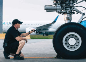- April – Eye for Detail: An aircraft maintenance engineer does a detailed inspection of an Airbus A330-200 nose landing gear. Photographer: Sylvain Trudel IAM Local 2309