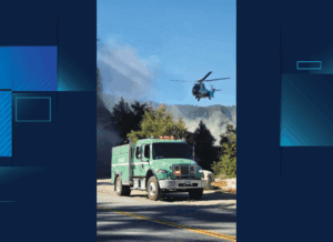 - February – Forest Service Fire Engine Responds to Medical Call: In Angeles National Forest, Clear Creek Engine 334 responds to a traffic collision on Angeles Crest Highway. A Los Angeles County Sheriff’s air rescue helicopter is in the background. Photographer: Steven Gutierrez NFFE-IAM Local 1650