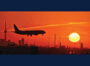 - May – Aircraft Cleared for Runway: An aircraft’s approach to the runway, with a scenic sunrise, the Toronto CN Tower, and the downtown cityscape visible in the background. Photographer: Sultan Baig IAM Local 2323